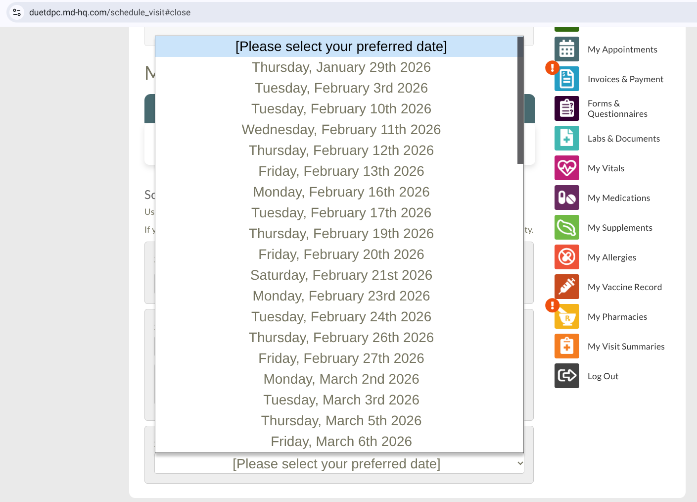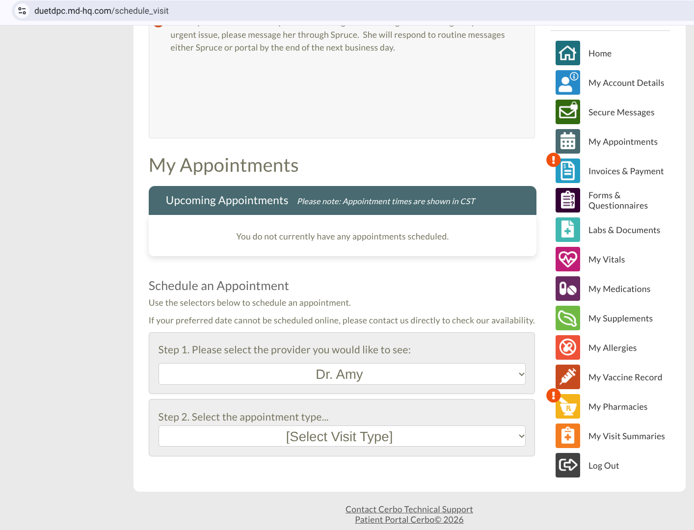 [ 3 ] From the appointments page, you can see any upcoming appointments you have. Below that, you can schedule an appointment. By default "Dr. Amy" will be selected. All you have to do is choose the Visit Type. Visit types include:
