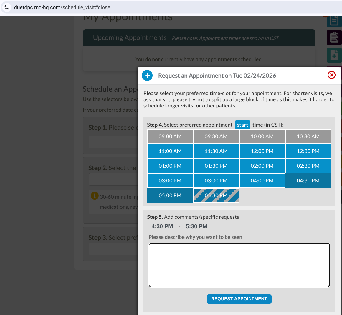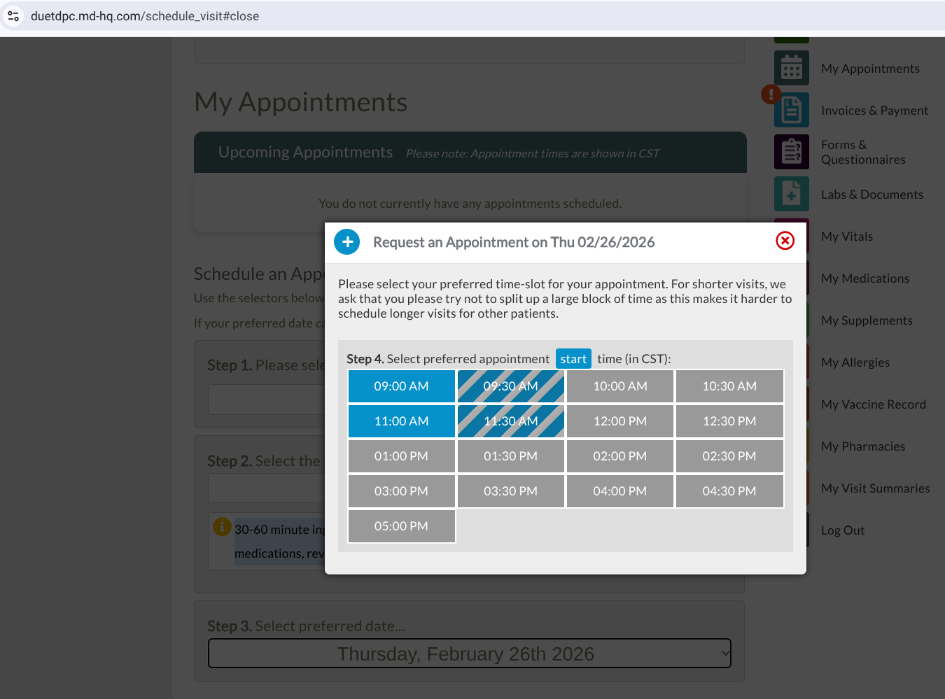 [ 5 ] With your date selected, choose a time from among the pop-up you can visit the office. Full blue rectangles are open time slots your appointment will fit in, blue/gray striped rectangles are open time slots your appointment will not fit in, and full gray rectangles are closed time slots.