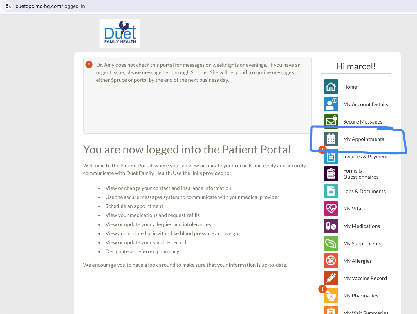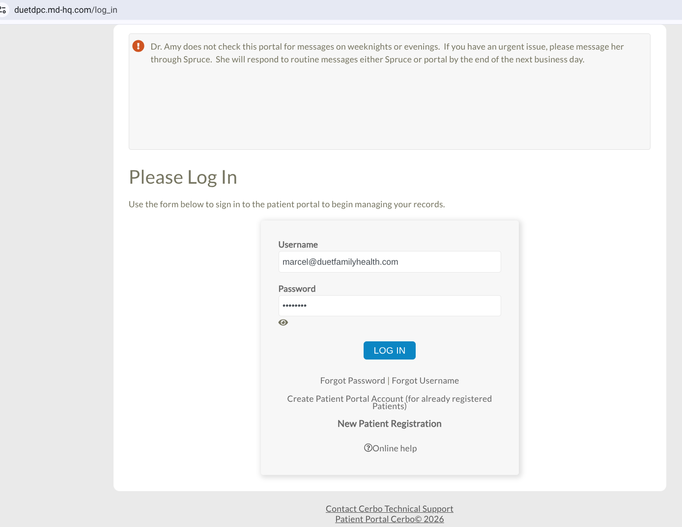 [ 1 ] Go to the portal log-in page, which can be found at: https://www.duetfamilyhealth.com/current-patients--2 or https://duetdpc.md-hq.com/log_in